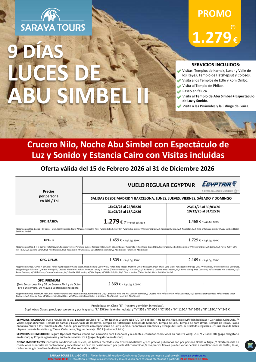 Luces de Abu Simbel 9d. Mad y Bcn*Crucero, Noche en Abu Simbel+Espectáculo y Cairo con Visitas*hasta Dec26